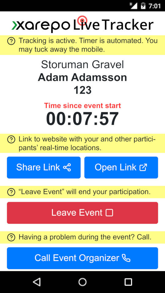 Vi erbjuder varje deltagare spårning under loppet genom att köra en gratis app tillhandahållen av våra sponsorer Xarepo AB och IT4U Sweden AB. Det gör att publik och vänner där hemma kan se var du och alla andra deltagare är ute på banan direkt här på webben.