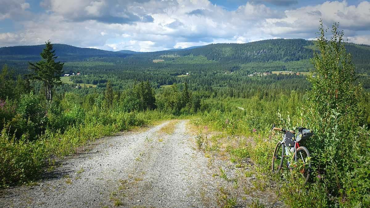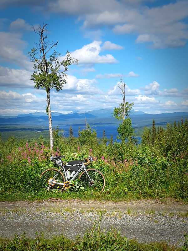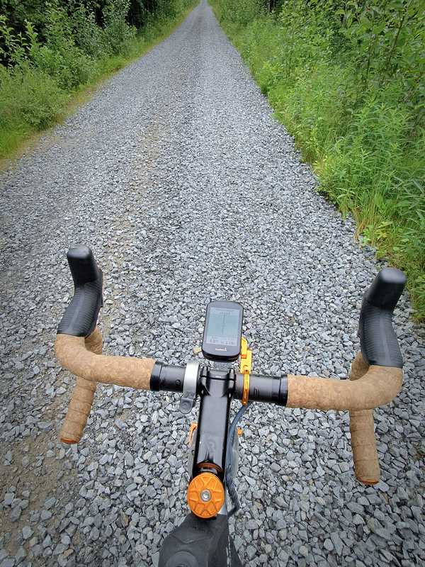 Exempel på cykel utrustad för Storuman Gravel XL. Sadelväska, lång topprörsväska, halv ramväska, 750 + 500 ml vattenflaskor i flaskställ med sidoplock. Reflexer via reflextejp på ramen, baklyse monterat på sadelstaget. Cykeldator/navigator i “outfront”-fäste (bilden tagen vid Kroksjön 127 km in på banan).