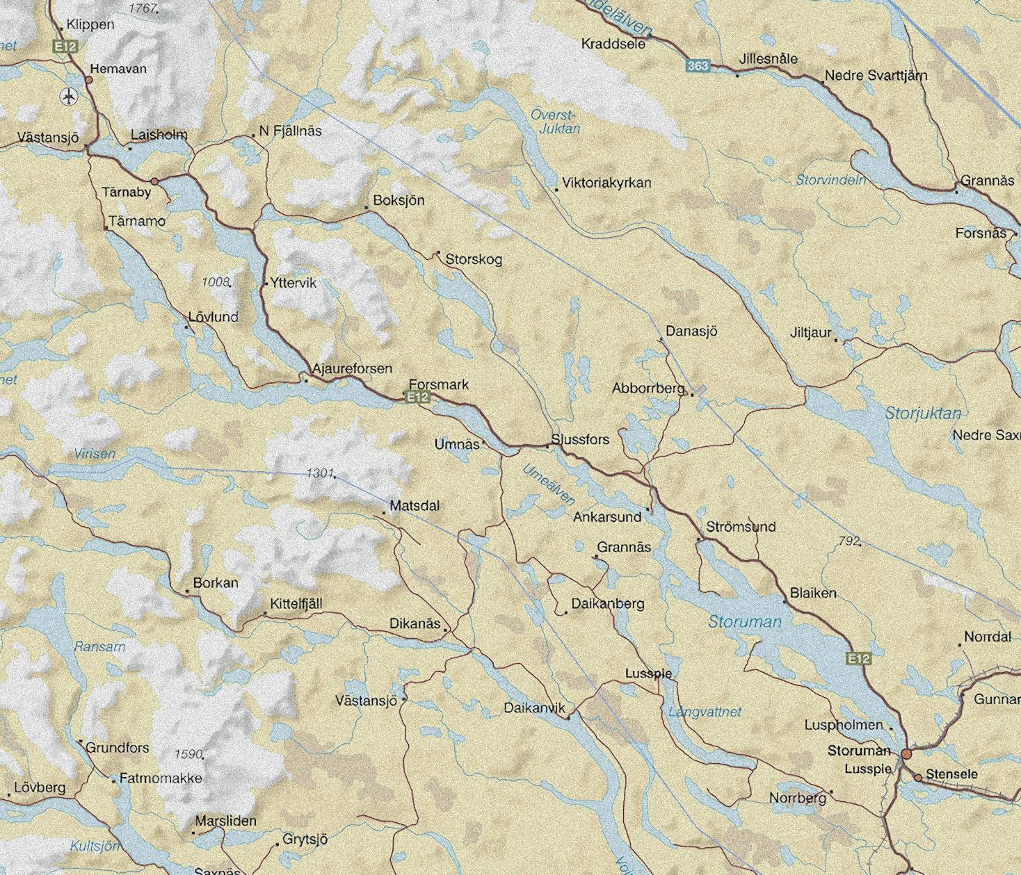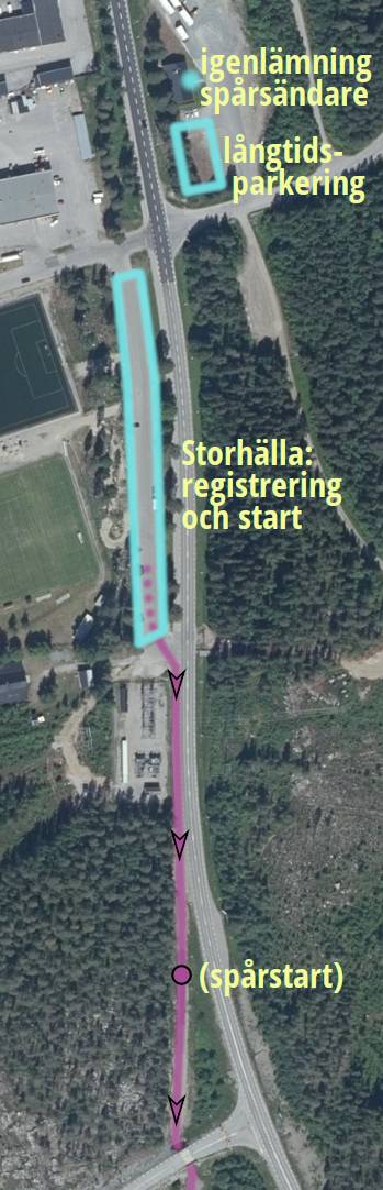 Starten hålls på den stora långsmala parkeringen (200 × 15 meter) vid Storhälla multiarena inne i Storuman. Tämligen osexig plats, men praktiskt och trafiksäkert om det skulle bli ett lite större startfält, därav valet. Banan börjar i direkt anslutning på cykelvägen ned mot Stensele. Navigationsfilens start (0 km) och första kontrollpunkt är en bit fram på cykelvägen markerad med “spårstart” i bilden intill, men startlinjen där vi släpper iväg startfältet och startar officiella tidtagningen kommer vara där på parkeringen.