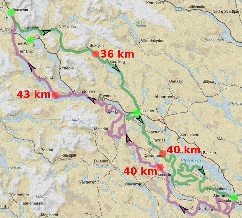 Tänk på att inte hela banan är körbar med bil, och vissa delar om än körbara är olämpliga att köra. Man bör hålla sig till de lite större vägarna. (Värt att notera är att det inte går köra bil ända upp till Björk, dvs målgång för etapp 1.)