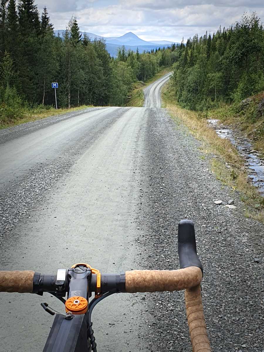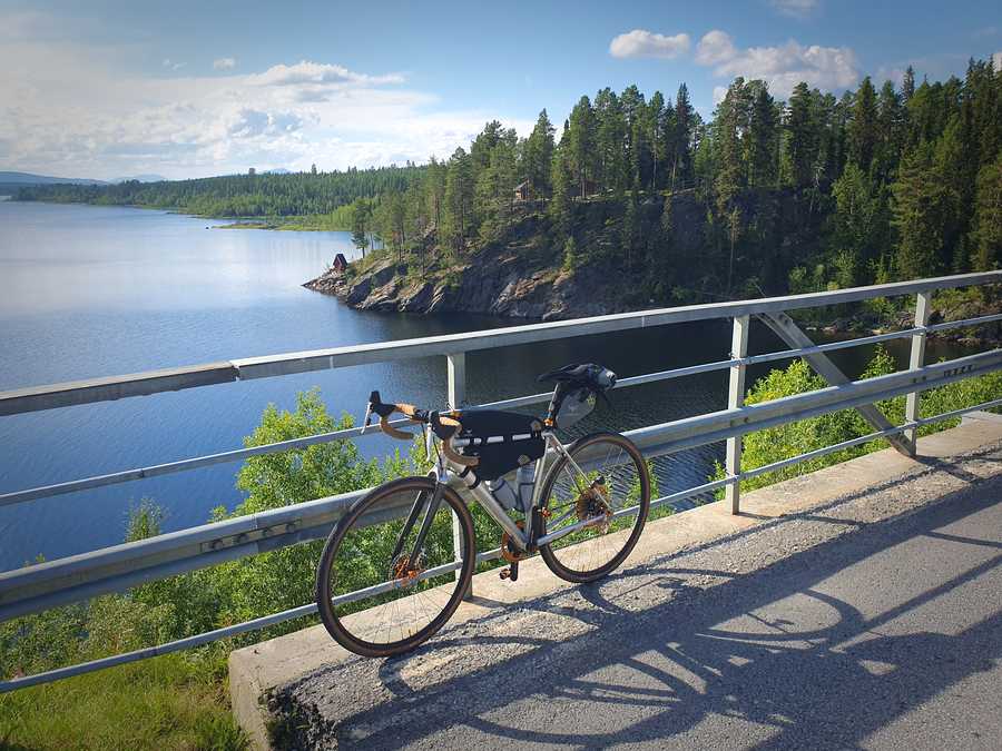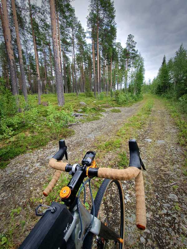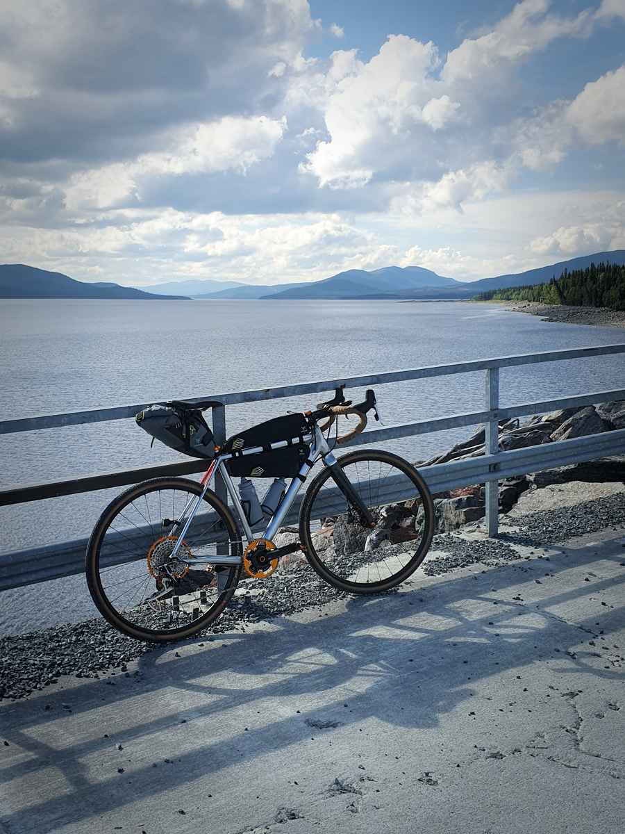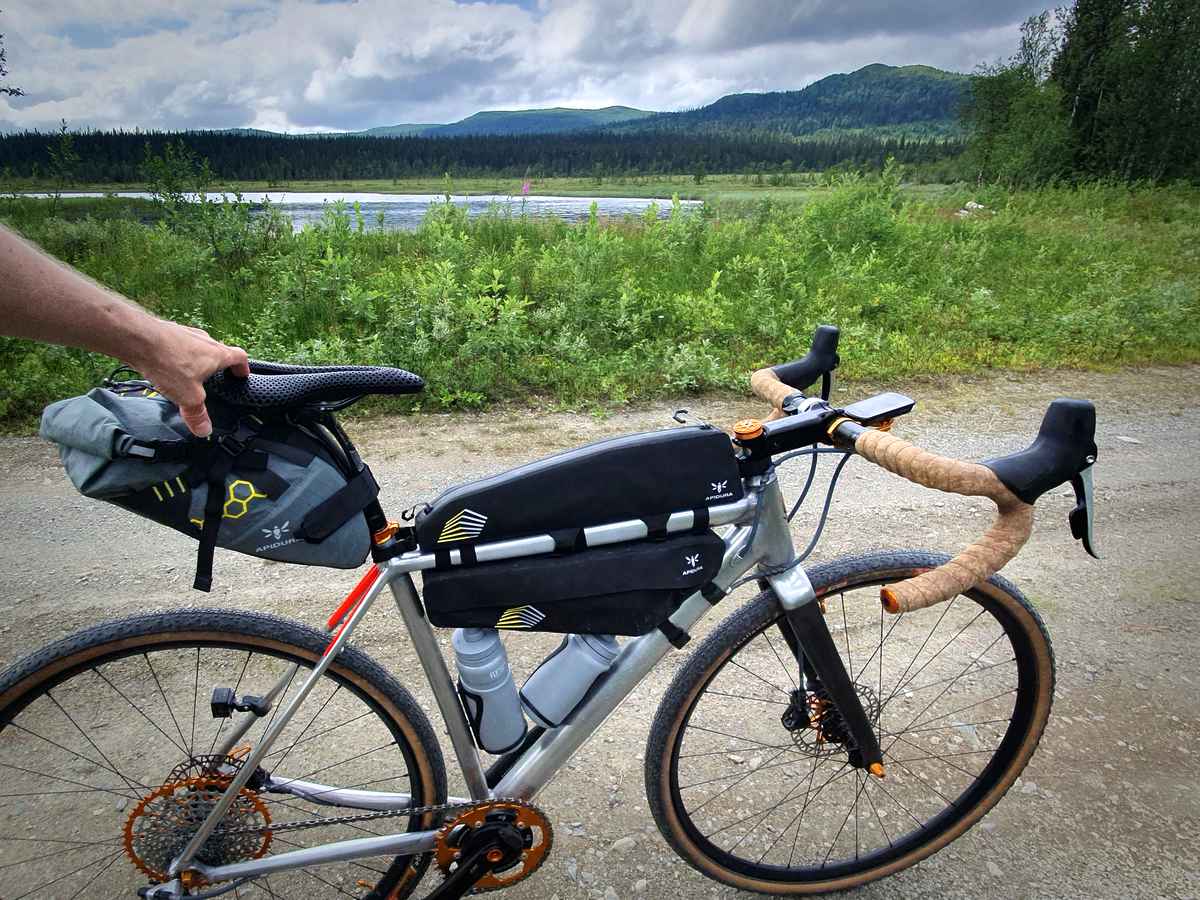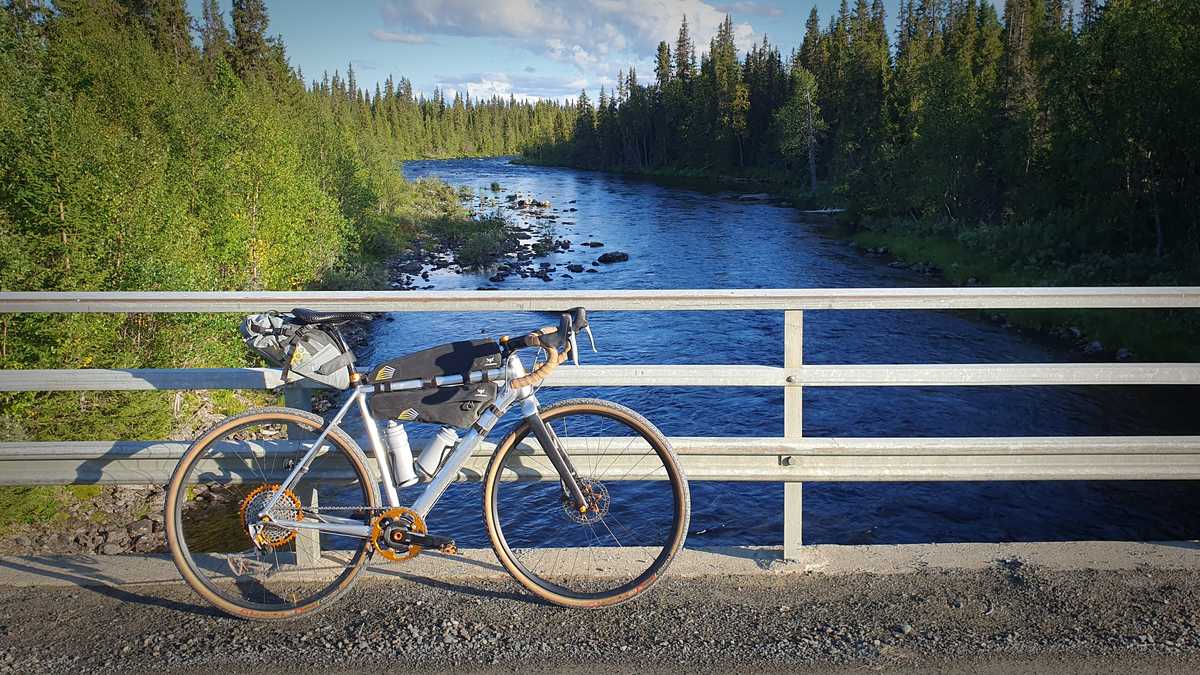 Exempel på cykel utrustad för Storuman Gravel XL. Sadelväska, lång topprörsväska, halv ramväska, 750 + 500 ml vattenflaskor i flaskställ med sidoplock. Reflexer via reflextejp på ramen, baklyse monterat på sadelstaget. Cykeldator/navigator i “outfront”-fäste (bilden tagen vid Kroksjön 127 km in på banan).