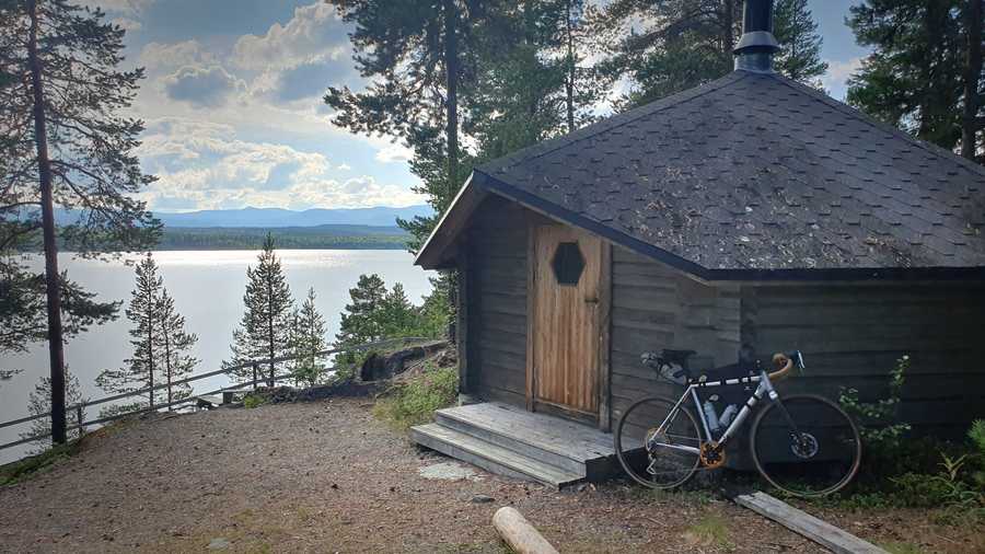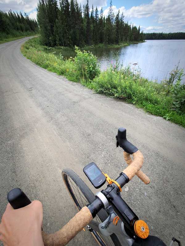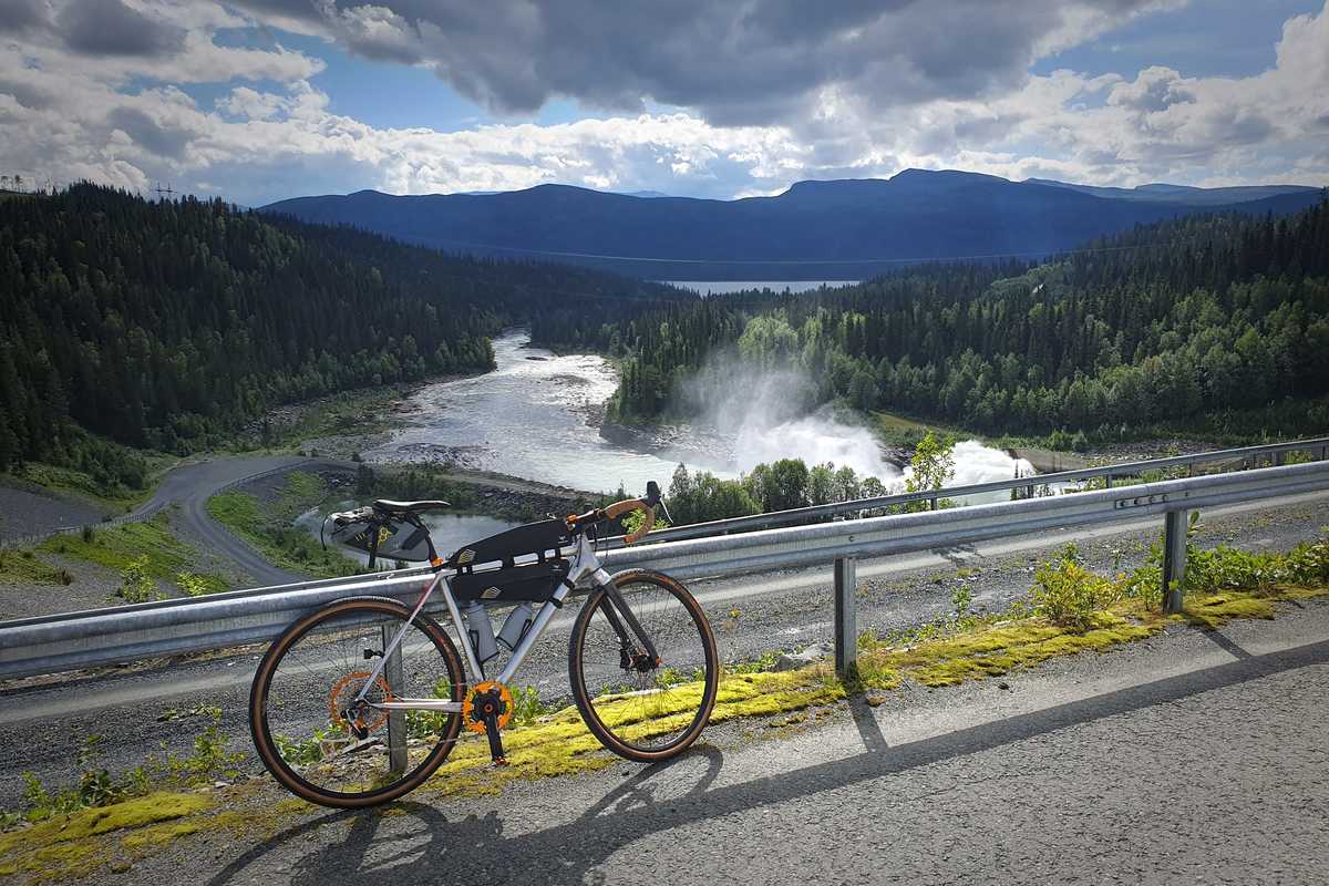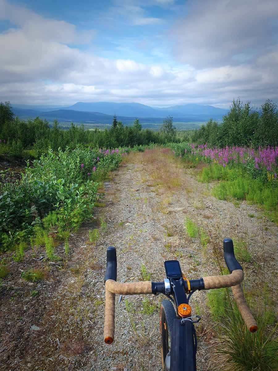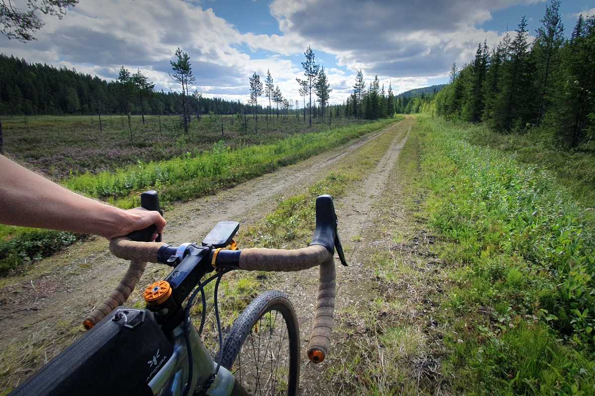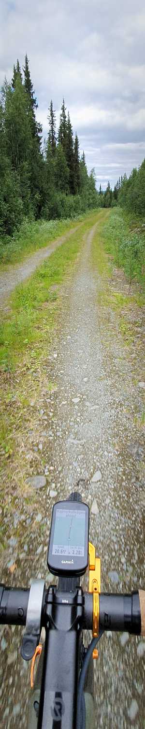 Exempel på cykel utrustad för Storuman Gravel XL. Sadelväska, lång topprörsväska, halv ramväska, 750 + 500 ml vattenflaskor i flaskställ med sidoplock. Reflexer via reflextejp på ramen, baklyse monterat på sadelstaget. Cykeldator/navigator i “outfront”-fäste (bilden tagen vid Kroksjön 127 km in på banan).