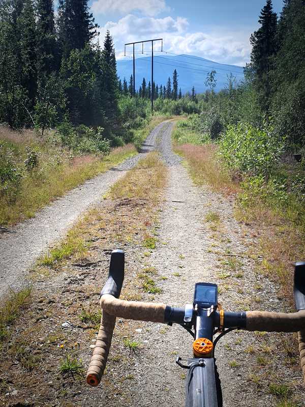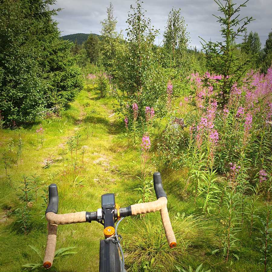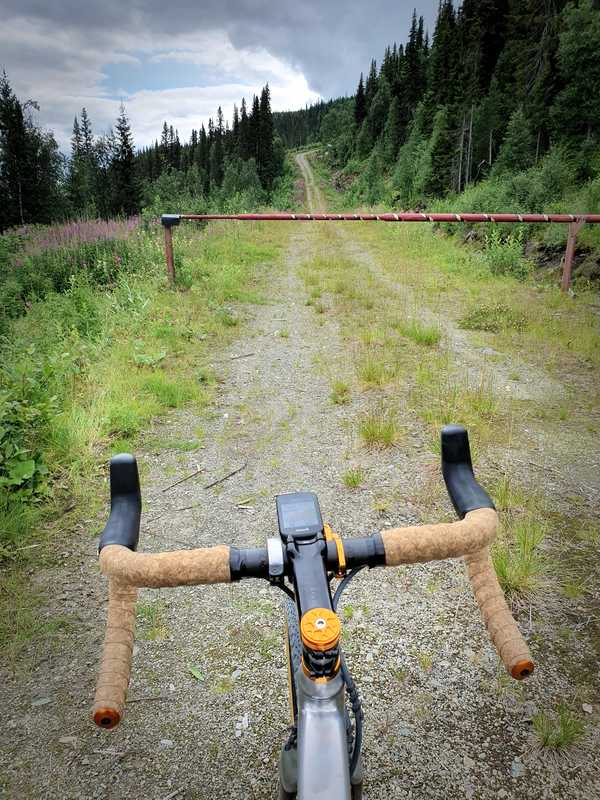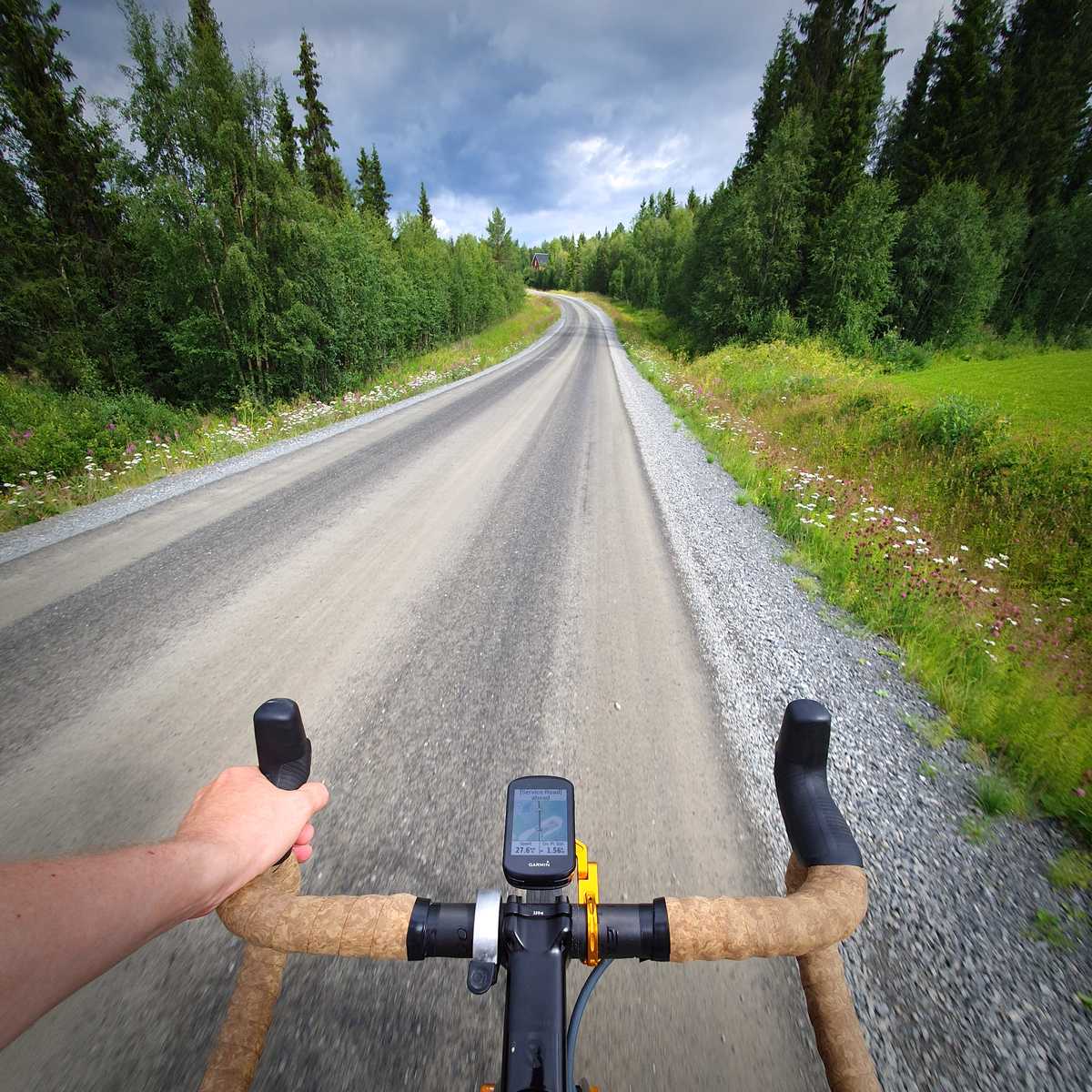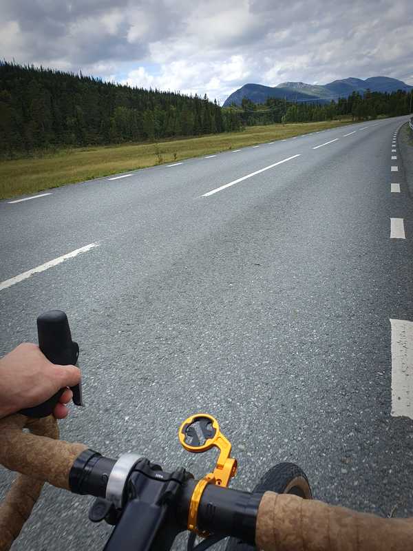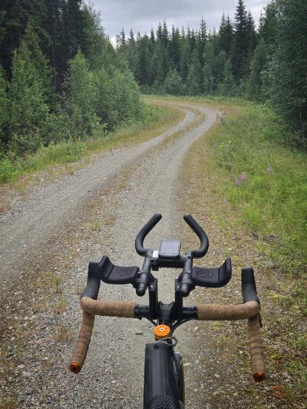 Tempostyre med montering anpassad för ultradistans. Armstöden relativt brett isär och monterade just bakom bockstyret, 7 cm höga spacers, styrpinnar med böj för en bekväm handposition med neutral handled. Bryggan med cykeldatorn hemgjord av en bit plaströr. Bilden från backen upp mot Kaskeluoktliden, 384 km in på banan.