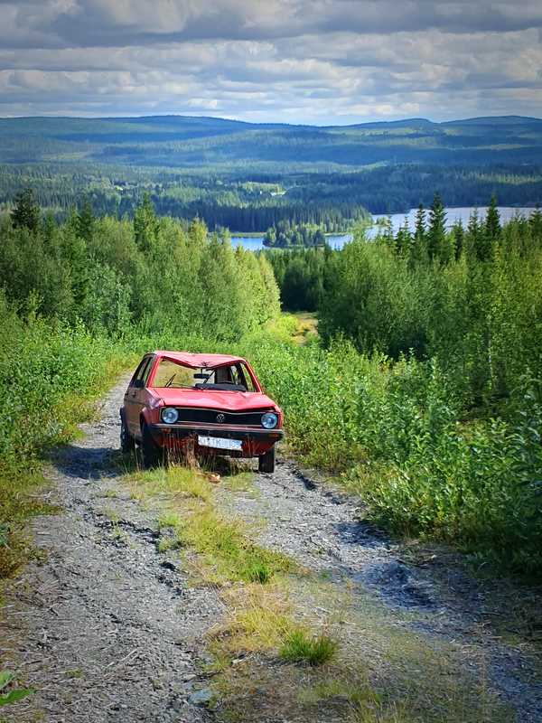 Älsoliden, vy mot Sparmanselet, 325 km in på banan. Illustrerar hur fårig de sällan använda skogsvägarna kan vara som värst i utförsbackarna efter en regnig sommar, och att man alltid måste vara beredd på oväntade hinder, som detta bilvrak.