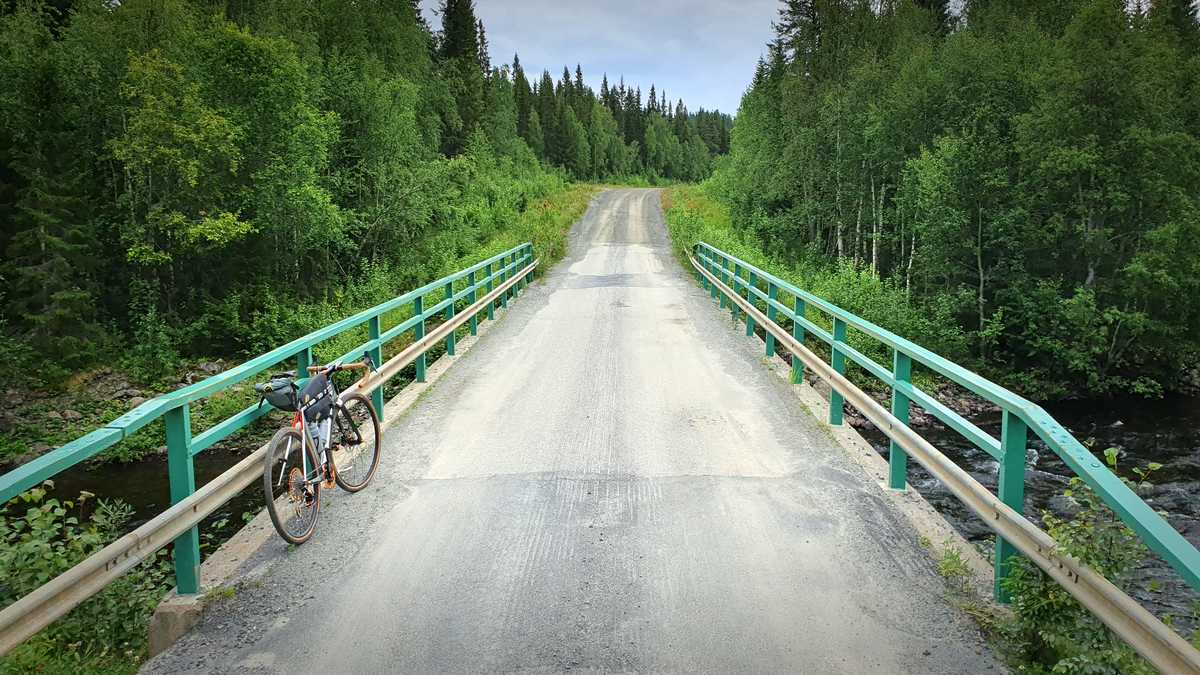 Kirjesån vid Nedre Boksjöns utlopp, 299 km in på banan. Relativt lätt cykling utför i 16 km mot Slussfors väntar.
