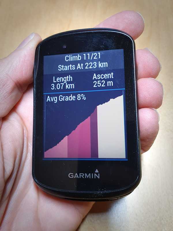 Höjddatat i våra filer har mycket hög kvalitet, så funktioner i cykeldatorn som kräver det fungerar väl. Här Garmin ClimbPro som visar klättringen i Hemavan upp till Björk, 223 km in på banan.
