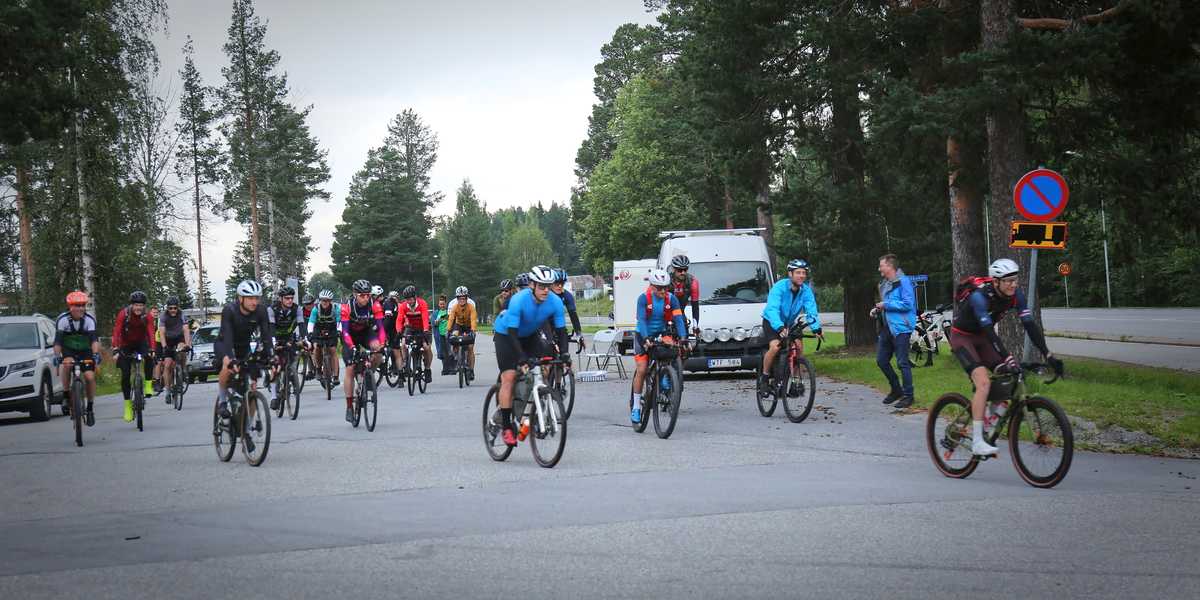 Starten på Storhälla kl 06:00 på lördagsmorgonen. Bilden är från första året Storuman Gravel XL hölls, dvs 2024. Detta år var loppet begränsat till bara 25 deltagare varav 24 dök upp, och 18 tog sig hela varvet runt.